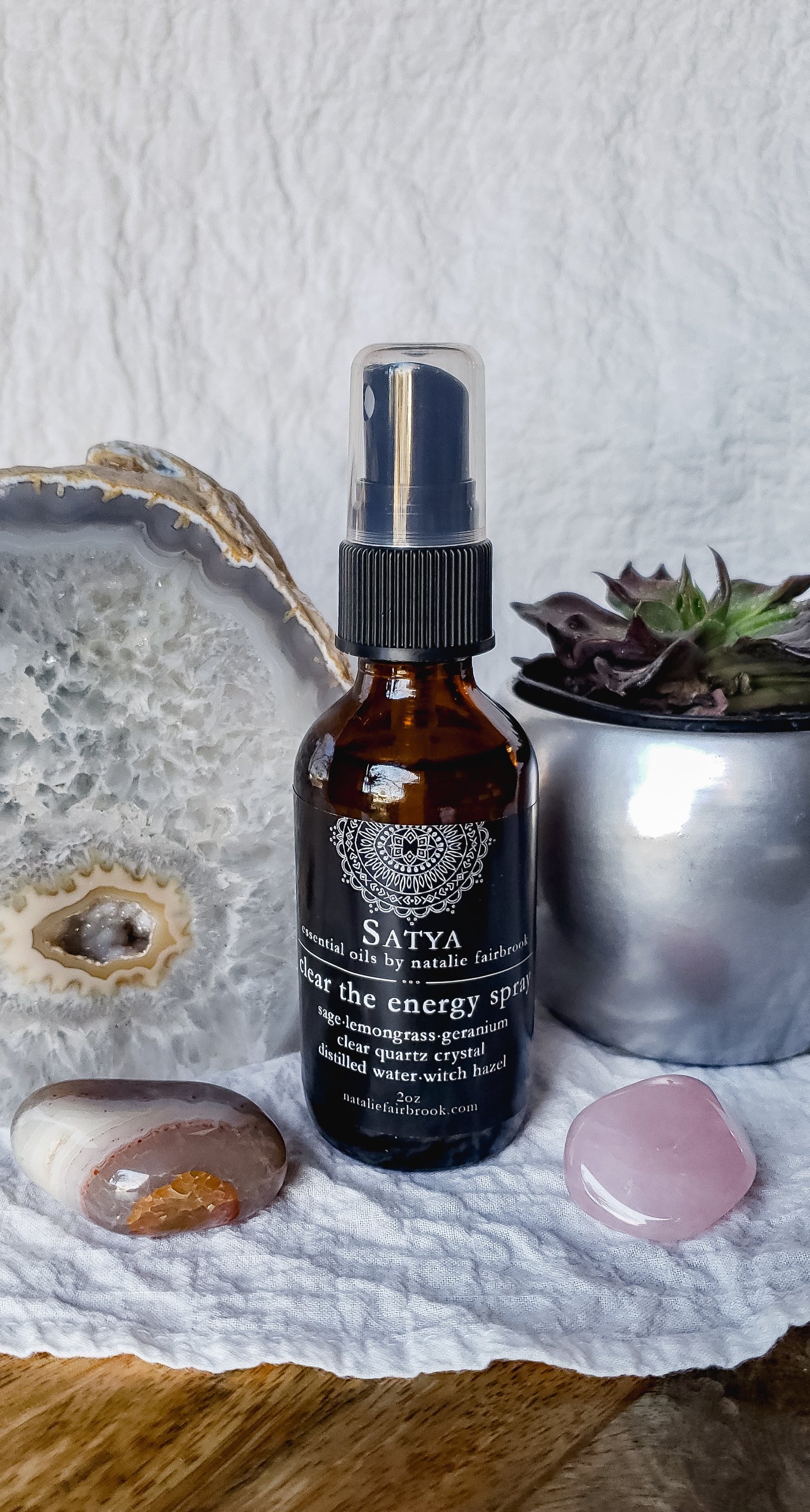 lemongrass, sage + geranium essential oils, distilled water + witch hazel, as well as a clear quartz crystal point to magnify the energy